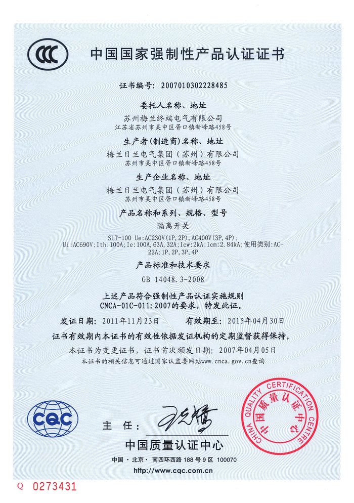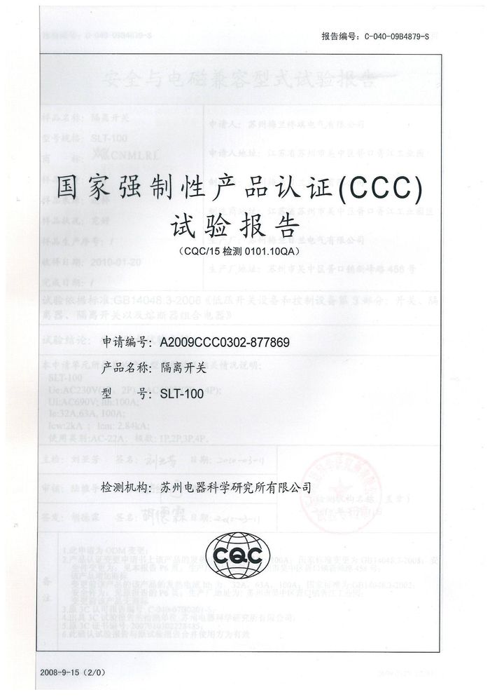 SLT-100隔離開(kāi)關(guān)資質(zhì)證書(shū)