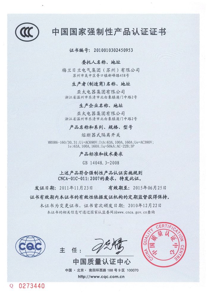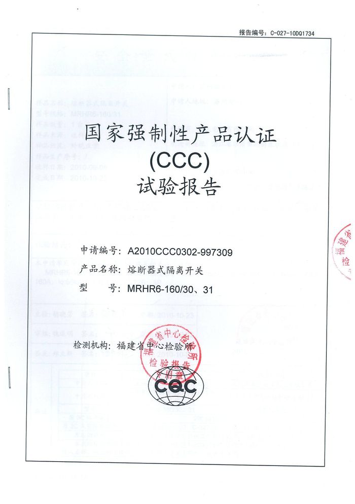 MRHR6-160熔斷隔離開關(guān)資質(zhì)證書