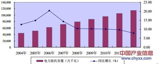 2004-2012年中國發(fā)電總裝機容量連續(xù)快速增長,“十一五”期間年均新增裝機容量近8,500萬千瓦,遠高于“十五”期間約4,600萬千瓦的年均新增容量。2012年發(fā)電總裝機容量達到11.45億千瓦,2015年,國內發(fā)電機裝機容量將達到14.37億千瓦左右,將超過美國而躍居世界第一。