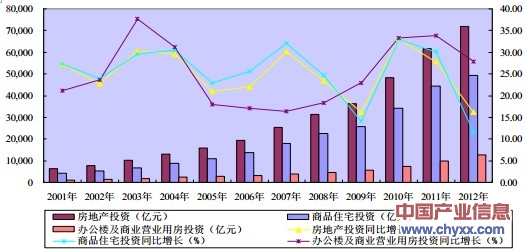 2001-2012年房地產投資、商品住宅投資、辦公樓及商業(yè)營業(yè)用房投資和變化趨勢