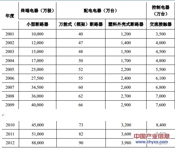 根據中國電器工業(yè)協會的統計,2001 年至 2012 年主要低壓電器產品的產銷量呈逐年上升趨勢,低壓電器產品保持較快速度增長,終端電器、配電電器、控制電器產量復合增長率分別為 21.86%、11.41%、10.50%,今后較長一段時間內我國低壓電器市場容量仍會穩(wěn)步增長。
