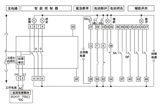斷路器總體接線(xiàn)端子共有47個(gè),接線(xiàn)簡(jiǎn)單、便于用戶(hù)使用