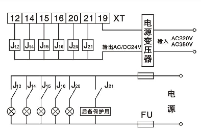 二次接線(xiàn)如圖所示[直流電源DC110V或220V從U1(+)、U2(-)輸入,直流電源模塊兩輸出端分別相應(yīng)與二次接線(xiàn)