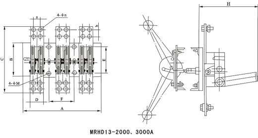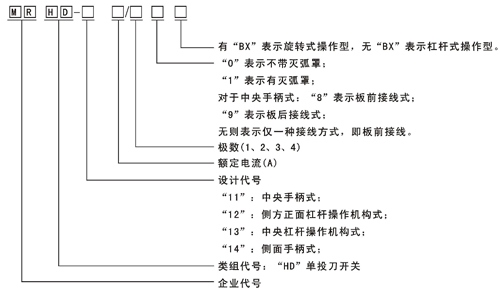 MRHD系列單投刀開關(guān)適用于交流50Hz、額定電壓至380V、直流至220V,額定電流至3000A的成套配電裝置中,作為不頻繁地手動(dòng)接通和分?jǐn)嘟弧⒅绷麟娐坊蜃鞲綦x開關(guān)用。其中: