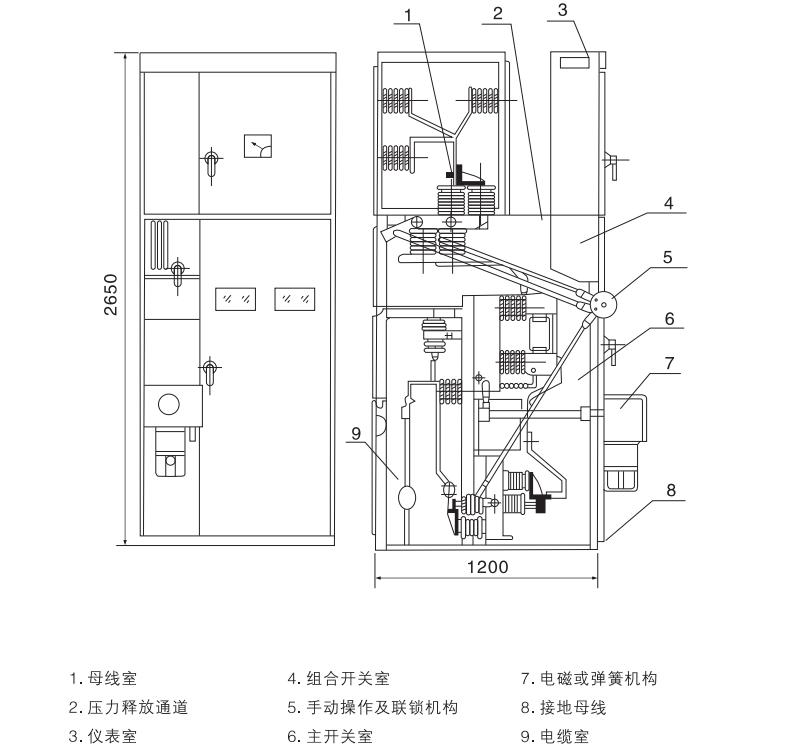 本開(kāi)關(guān)柜為金屬封閉箱型結(jié)構(gòu),柜體骨架由角鋼焊接而成.柜內(nèi)用鋼板分隔成斷路器室,母線室,電纜室,繼電器室,并可通過(guò)門(mén)面上的觀察窗和照明燈觀察柜內(nèi)各主要元件的運(yùn)行情況。為提高開(kāi)關(guān)柜的技術(shù)性能,各主要元件進(jìn)行了重新設(shè)計(jì)(如斷路器,旋轉(zhuǎn)式隔離開(kāi)關(guān)等),根據(jù)柜體布置,繼電器室可安裝繼電器,門(mén)上可裝設(shè)信號(hào)繼電器、指示儀表、信號(hào)燈,轉(zhuǎn)換開(kāi)關(guān)安裝于操作小室。后面為母線室,下面為電纜室,用戶(hù)可方便地進(jìn)行接線,前面為斷路器室,方便了開(kāi)關(guān)柜主開(kāi)關(guān)的檢修,柜體內(nèi)部機(jī)構(gòu)參見(jiàn)圖1、圖2和產(chǎn)品說(shuō)明書(shū)。